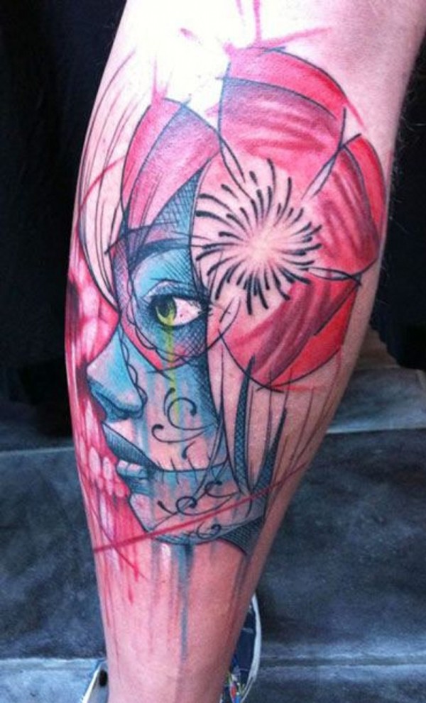 腿部水墨色死亡女孩纹身图案
