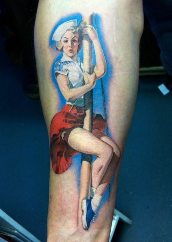 腿部彩色女水手爬杆纹身图案