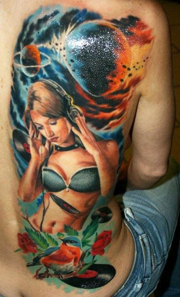 背部彩色拼贴空间和女孩纹身图案