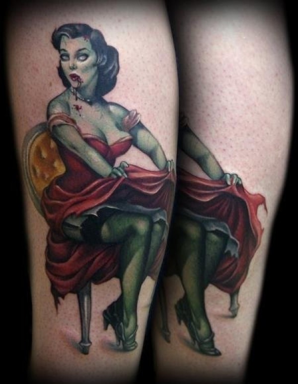 腿部彩色僵尸女郎纹身图案