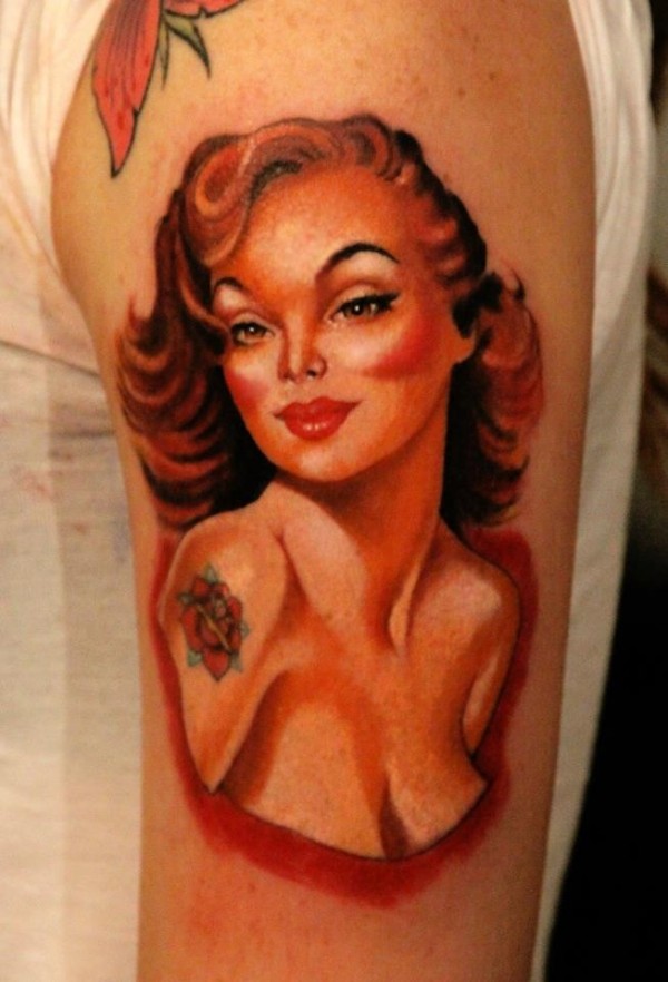 肩部彩色老式的女孩肖像纹身图片