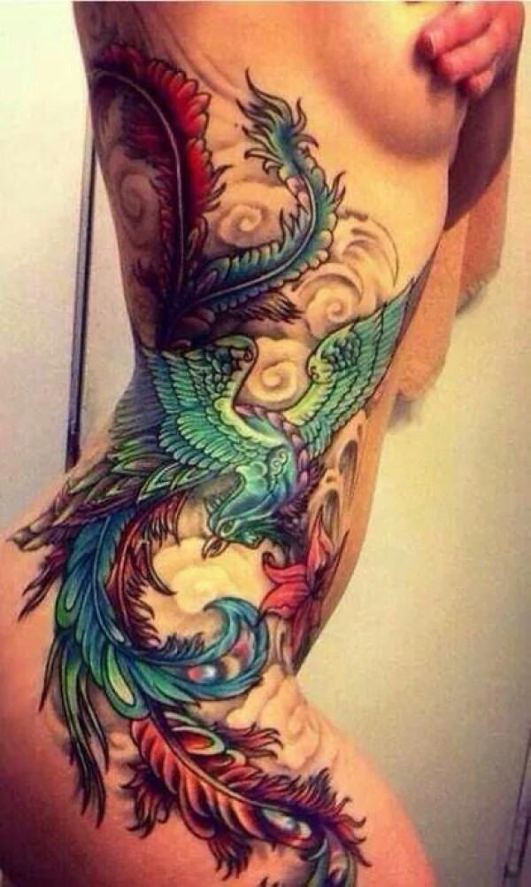 女性腰侧漂亮的孔雀纹身图案