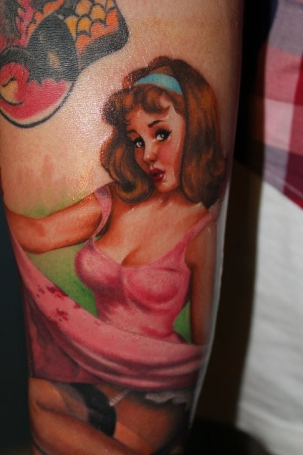 腿部彩色性感粉红女郎纹身图案