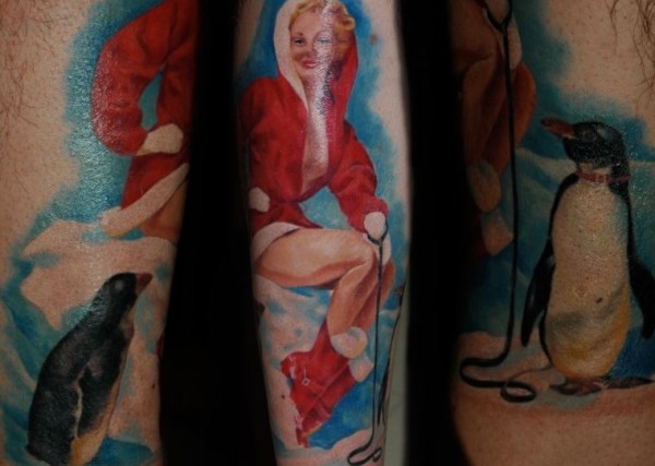 腿部色彩鲜艳的圣诞海报女郎纹身