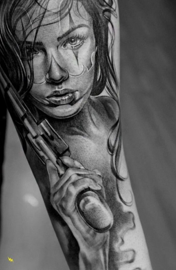 肩部灰色持枪死亡女神纹身图案
