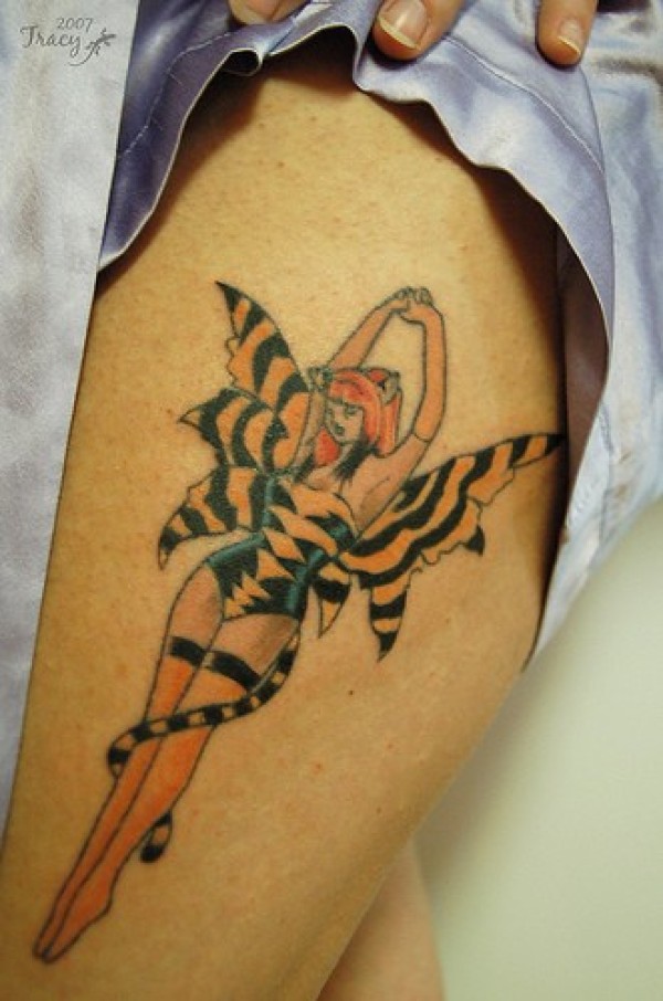 腿部彩色跳舞的女孩纹身图案