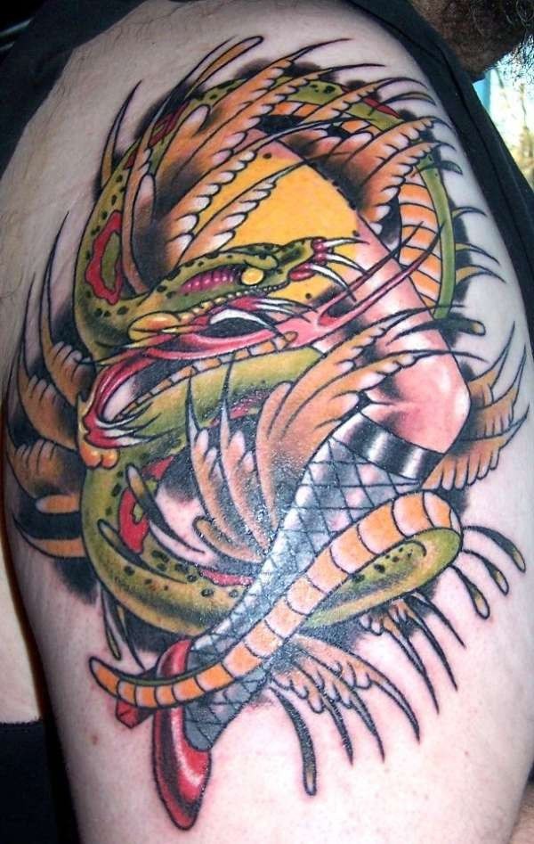 肩部彩色中国龙与腿纹身图案