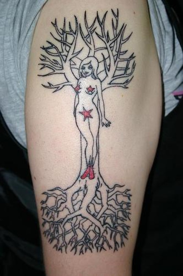 肩部简约树与裸体女孩纹身图案