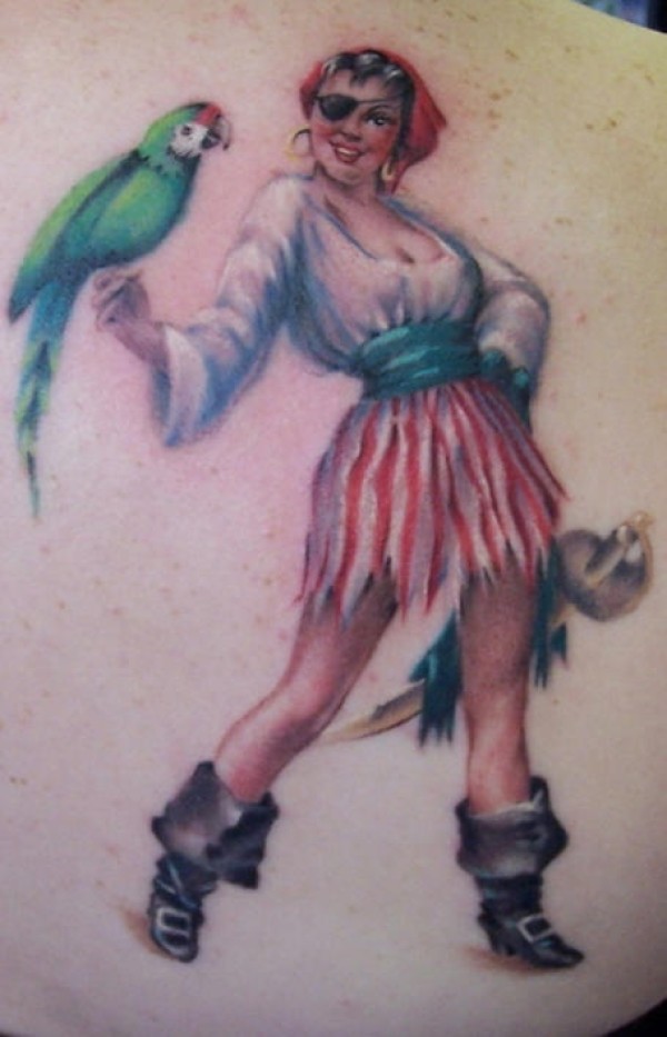 肩部彩色海盗女孩与鹦鹉纹身图片