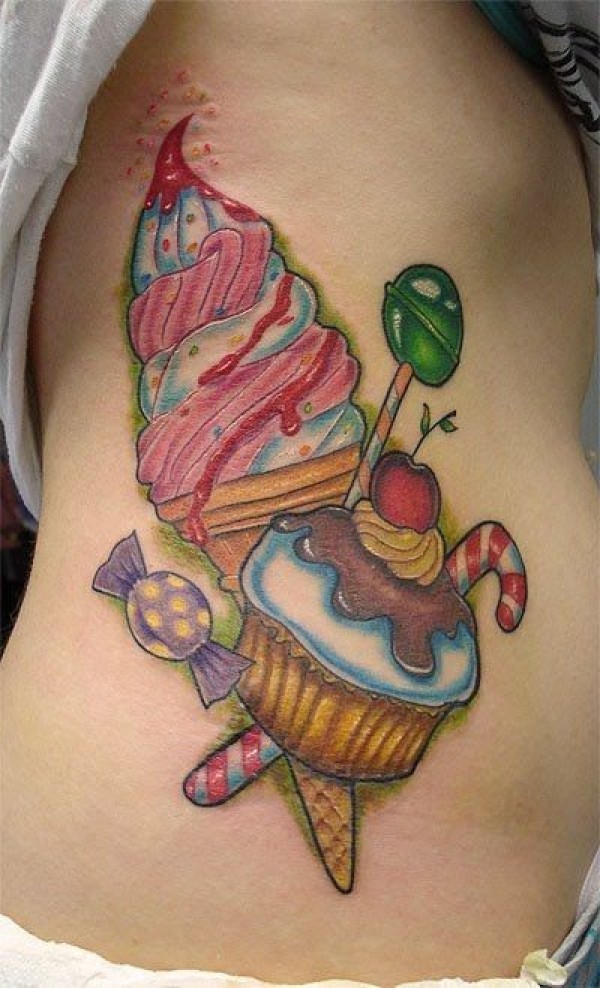 腰侧彩色冰淇淋和甜糖果纹身图案