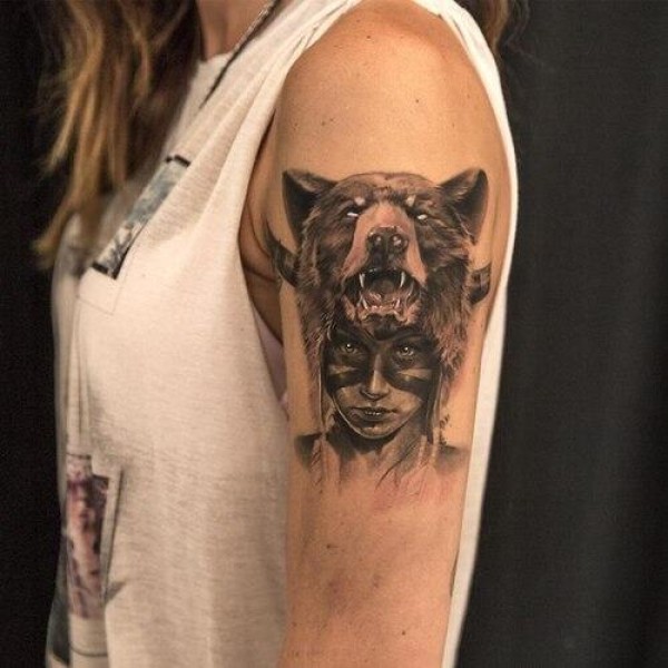 肩部灰色保鲁夫狼头和女孩纹身图片