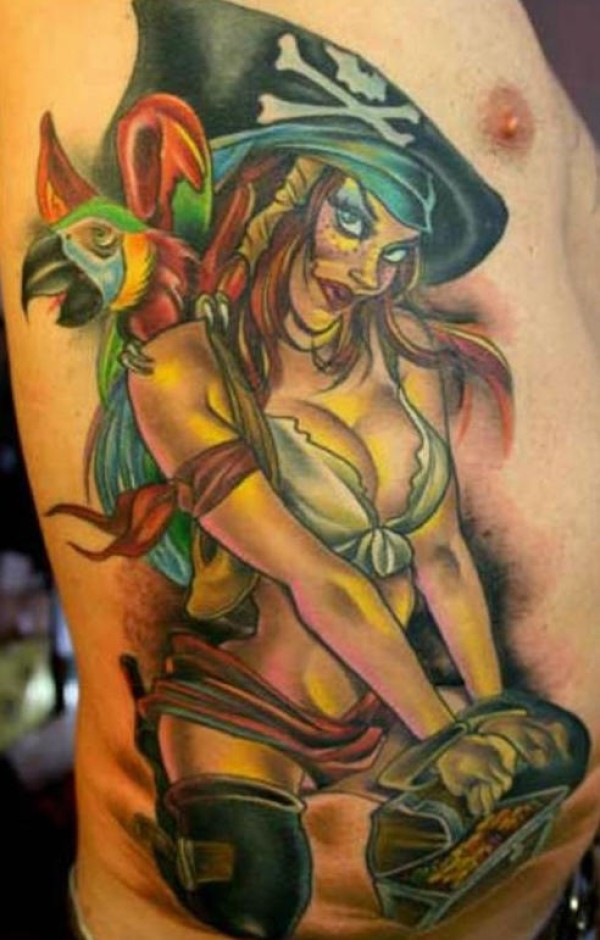 腰侧彩色海盗性感女孩和鹦鹉纹身