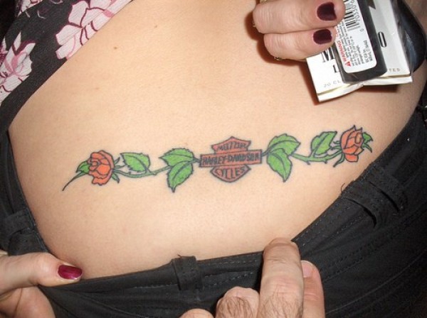 腹部彩色哈雷戴维森标志玫瑰纹身