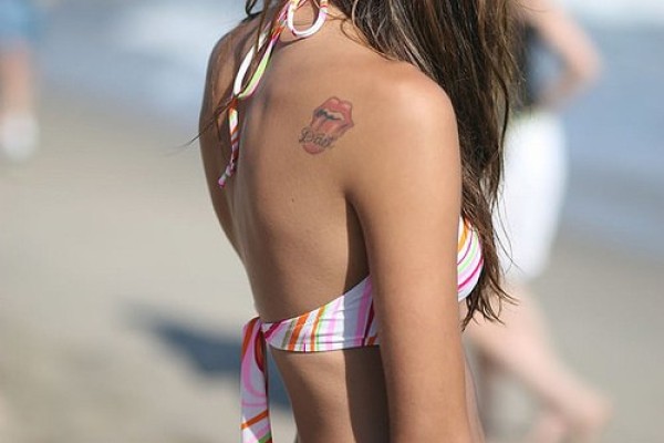 女性肩部彩色嘴唇标志纹身图案