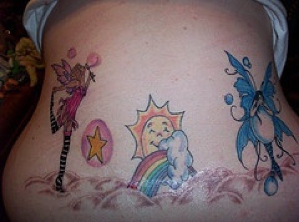 腰部彩色少女的彩虹蝴蝶纹身图案