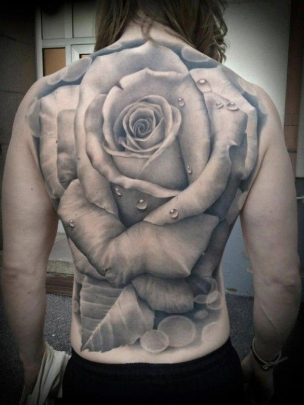 满背灰色逼真的玫瑰花纹身图案