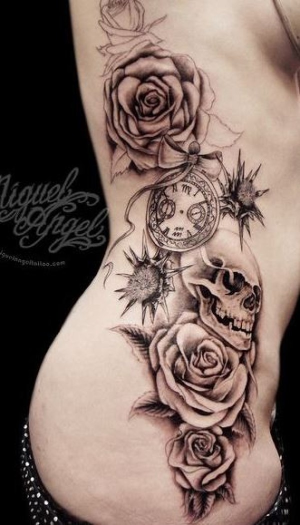 女性腰侧棕色大玫瑰与骷髅纹身图案