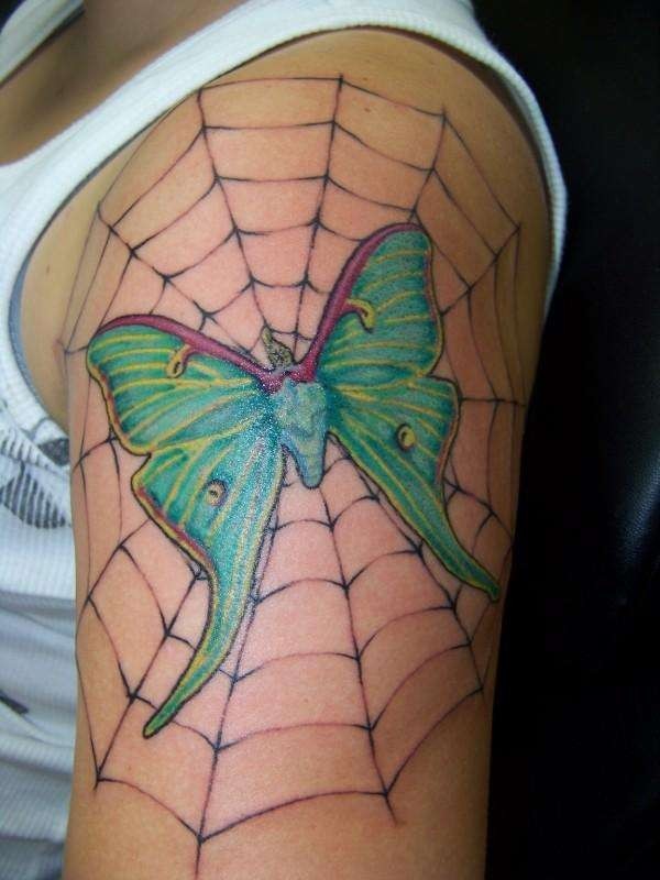 肩部彩色蜘蛛网与飞蛾纹身图案