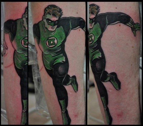 腿部彩色漫画风格绿灯侠纹身图案
