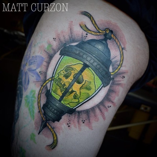 腿部新风格的彩色旧打火机与头骨纹身