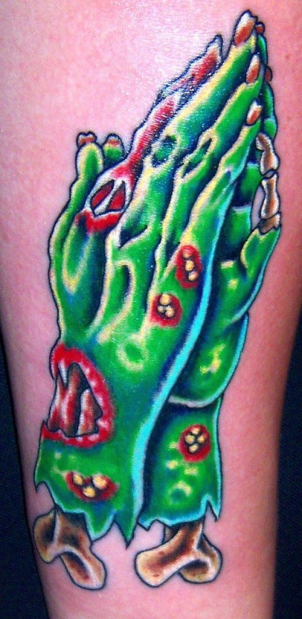 腿部彩色僵尸祈祷手纹身图片