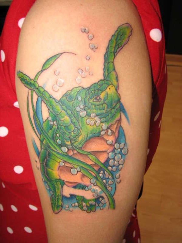 肩部绿海龟在海洋中游泳的纹身