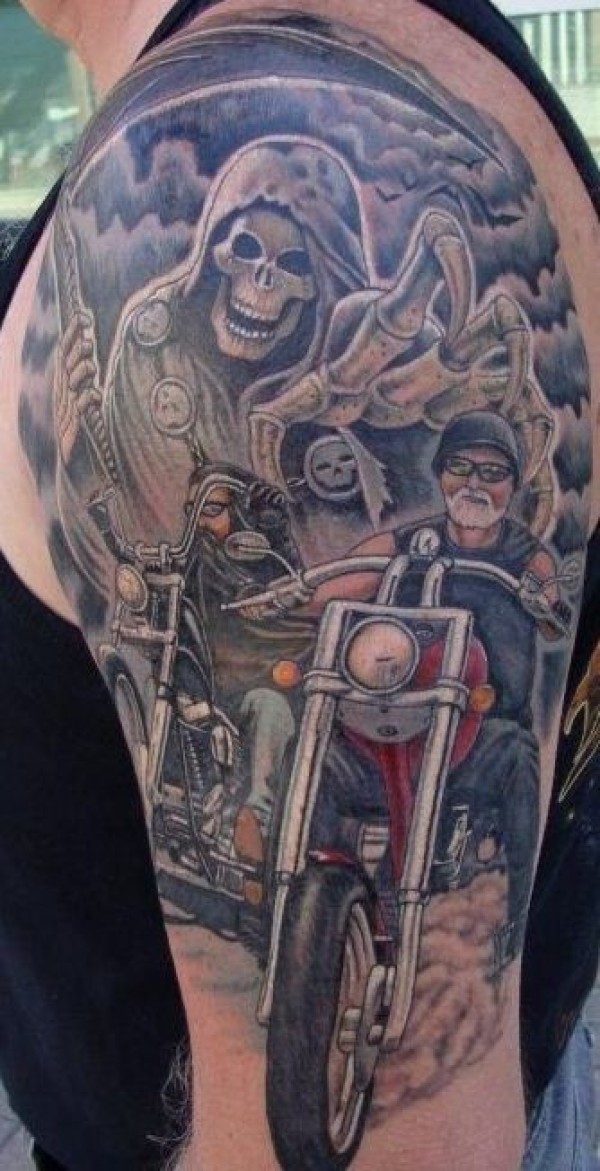 肩部彩色老骑士和死神纹身图案