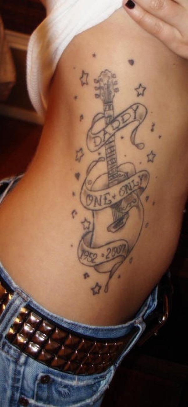 腰侧简约吉他和星星纹身图案