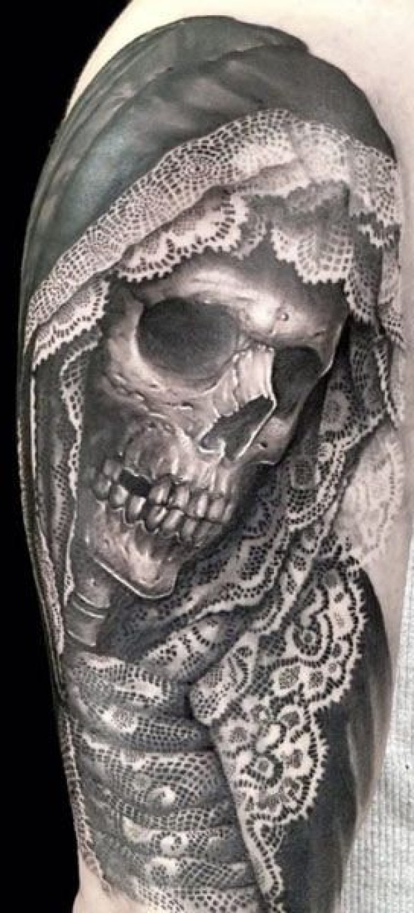 肩部黑灰戏剧性风格骷髅头纹身图案