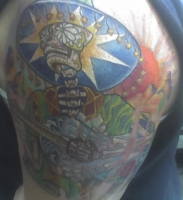 肩部彩色糖骨架与草帽纹身图案