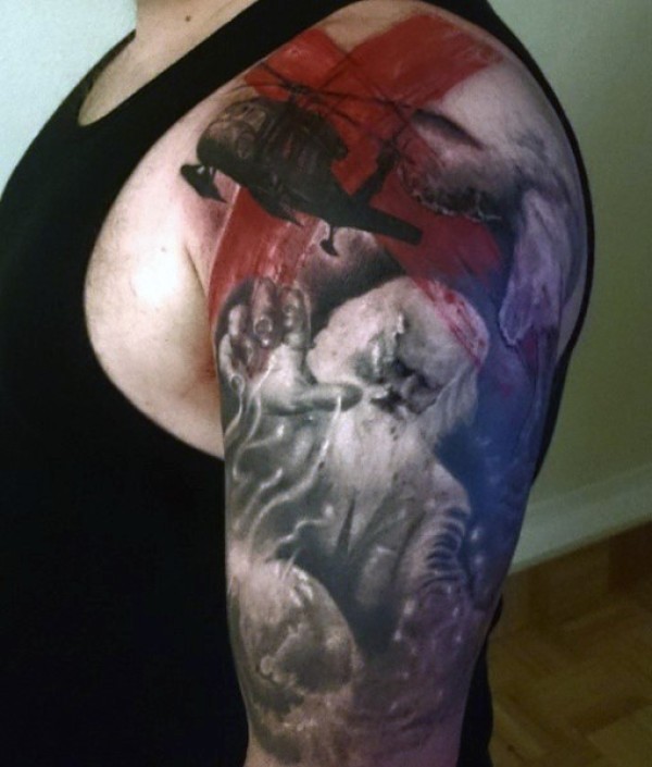 肩部军用彩色大直升机纹身图案