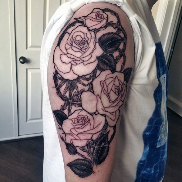 肩部黑色玫瑰和荆棘纹身图案
