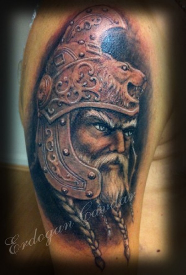 肩部彩色的维京战士肖像纹身图案