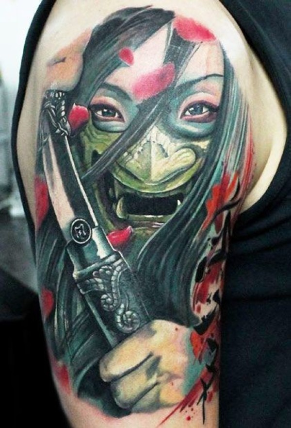 肩部彩色日本武士面具纹身图案