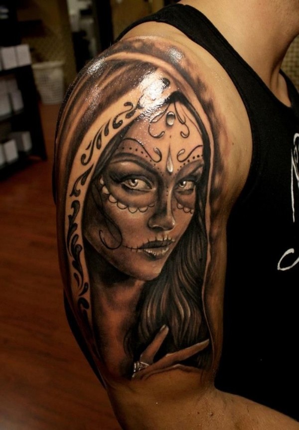 肩部棕色墨西哥头骨女孩肖像纹身图案