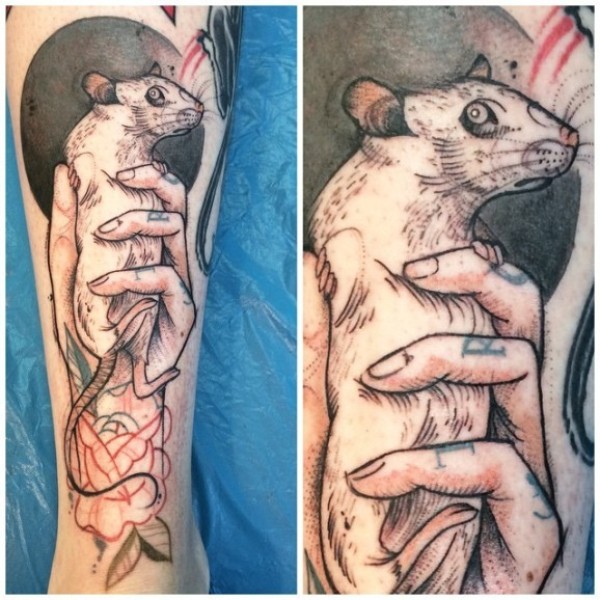 腿部素描风格彩色老鼠纹身图案