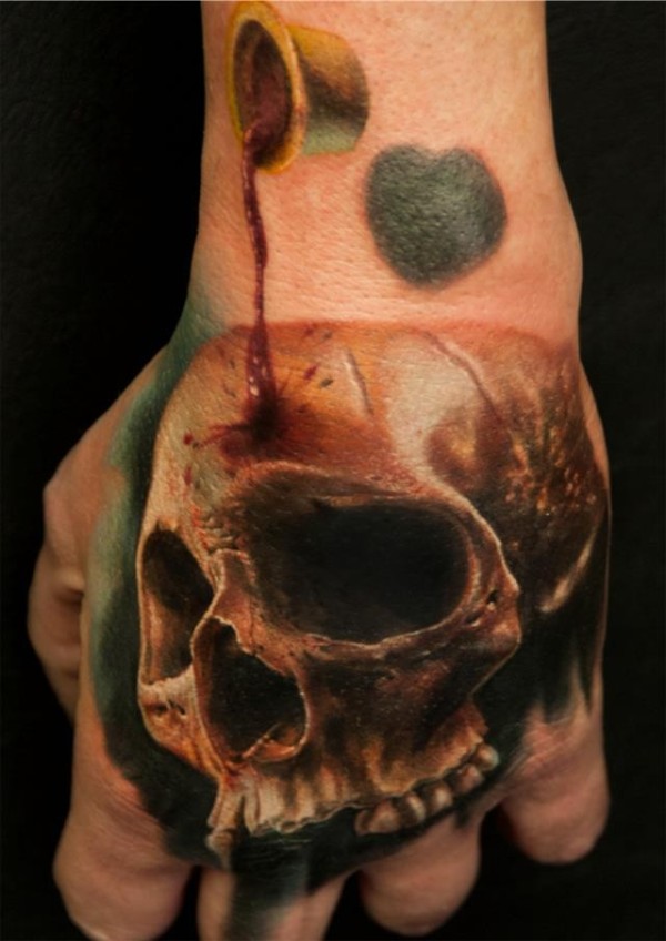 手背现实主义风格神秘彩色骷髅纹身