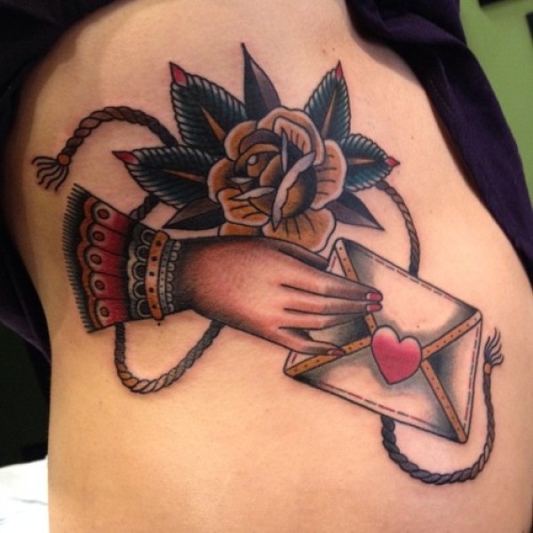 腰侧全新流派彩色妇女手信封和玫瑰纹身