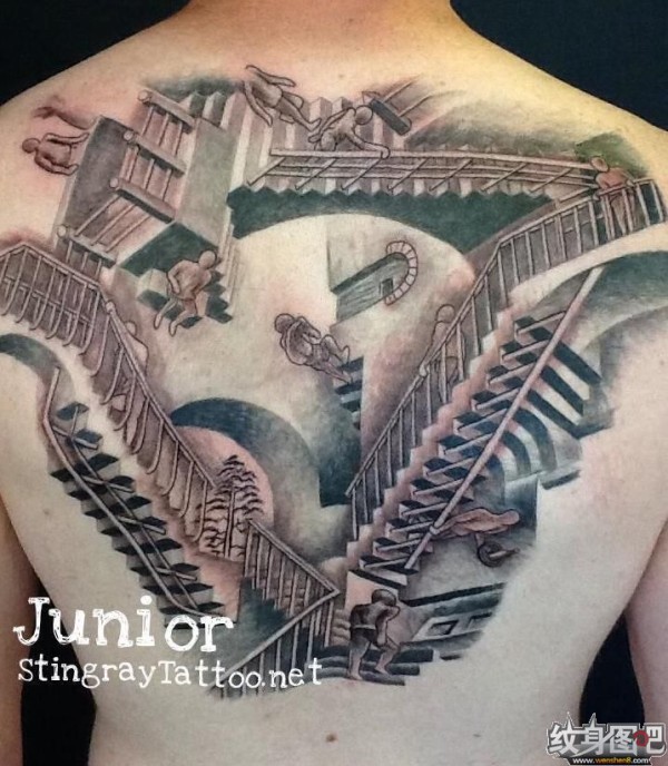 几组方向奇怪的楼梯组成的满背纹身