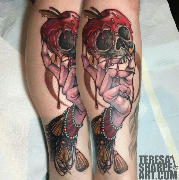 腿部滑稽的彩色头骨形状的苹果纹身图片