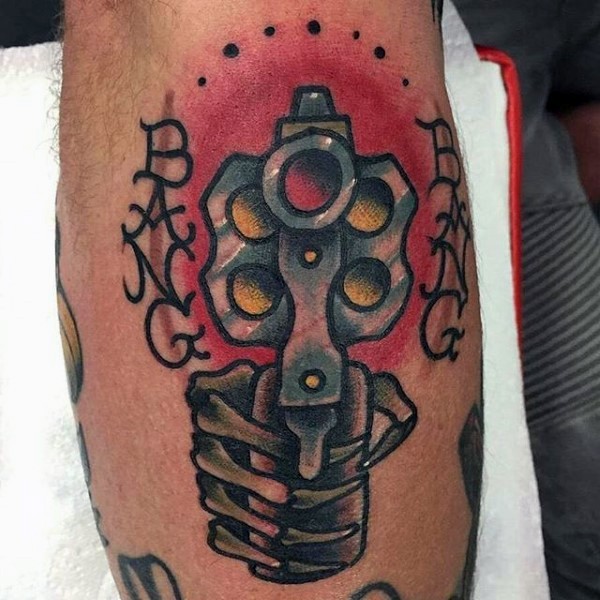 手臂老派风格的彩色骷髅手与左轮手枪纹身