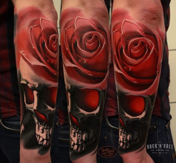 手臂逼真的彩色人头骨与玫瑰纹身
