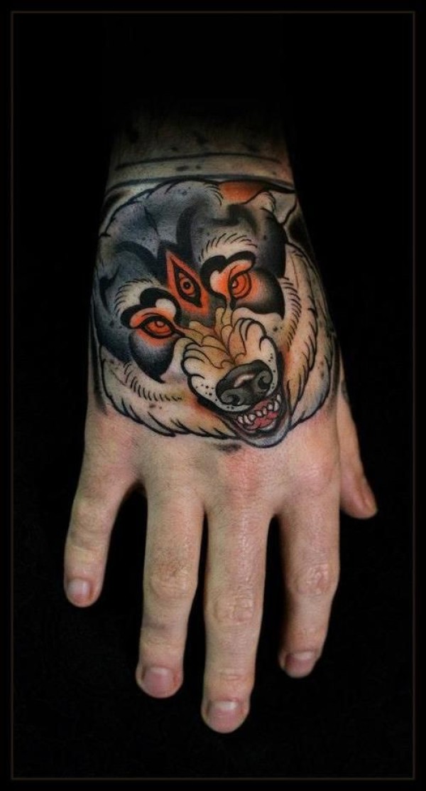 手背彩色老学校的风格神秘恶魔狼纹身