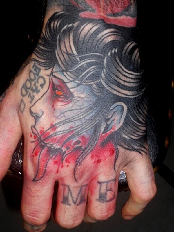 手背彩色令人毛骨悚然的血腥僵尸女头纹身