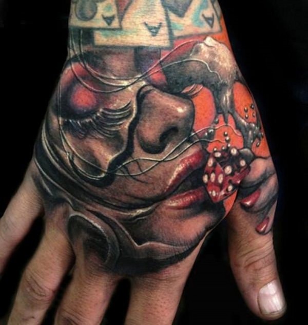 手部彩色女子肖像与红骰子纹身图片