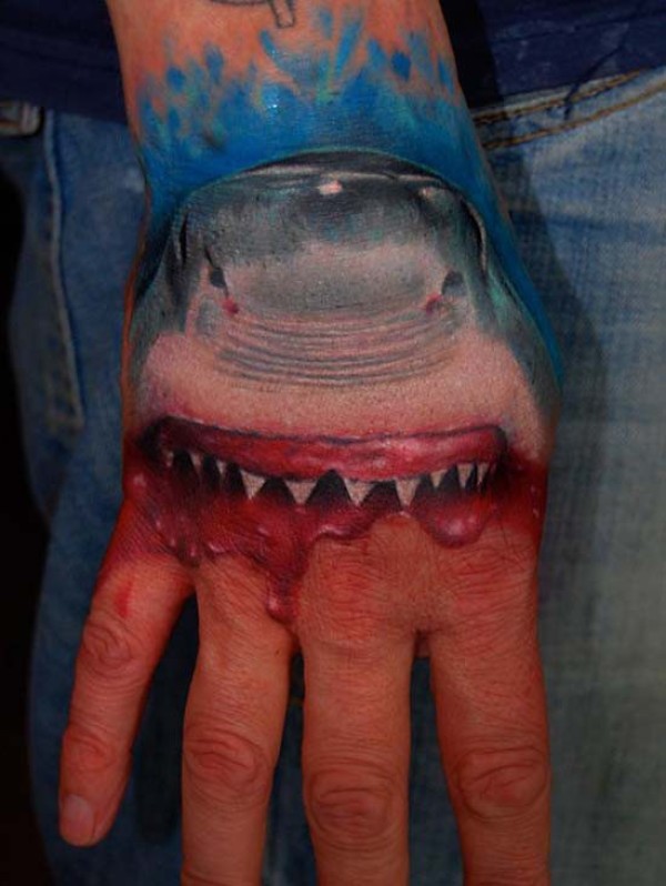 手背彩色逼真的鲨鱼电影纹身图案