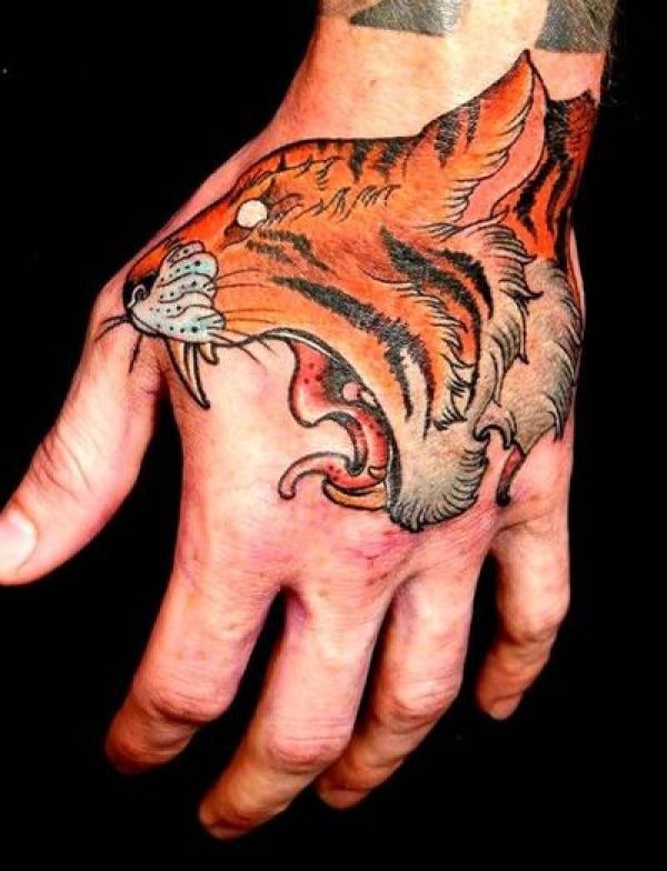 手背彩色咆哮的老虎头纹身图案