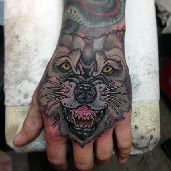 手背老派风格的彩色愤怒狼纹身图案