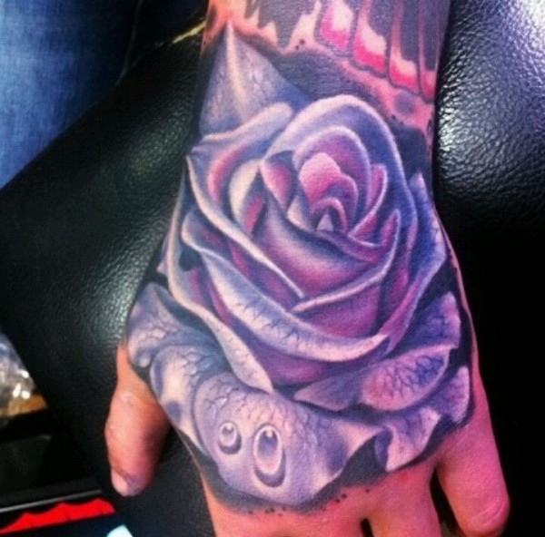 手部彩色玫瑰花与露珠纹身图案