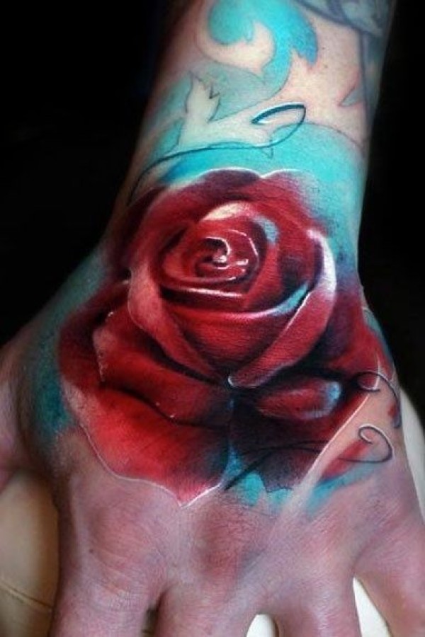 手背水彩色红玫瑰花纹身图案